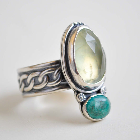 Prehnite and Turquoise Ring—Size 8.5