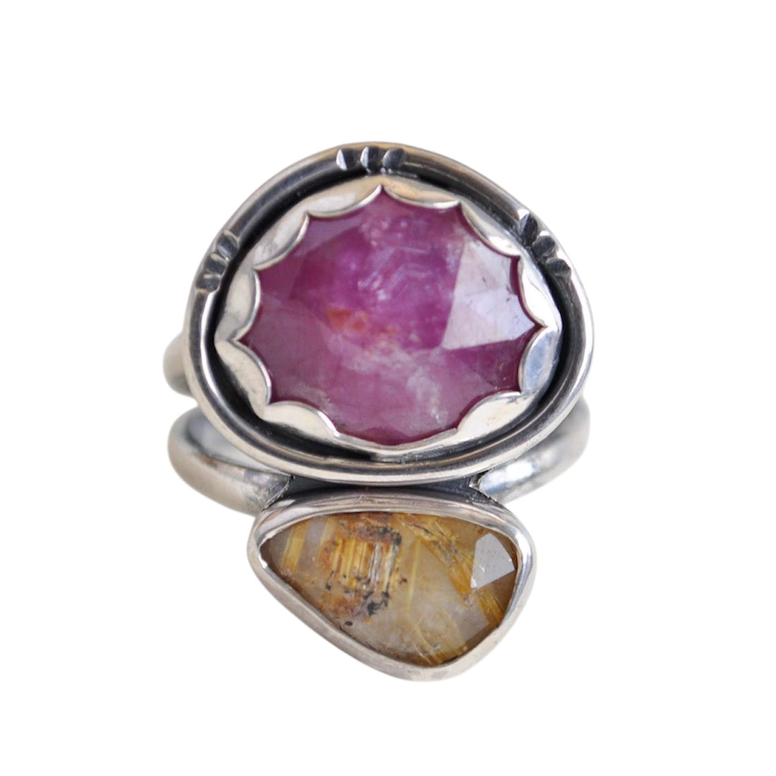 Pretty pink rose cut ruby gemstone paired with a golden rutilated quartz gemstone. This ring is a size 8 and cannot be sized. Sterling silver and great for daily wear.
